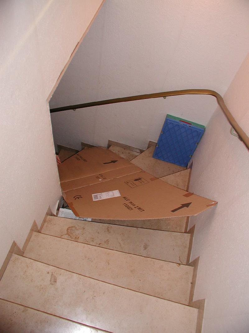 ... und ein Transportversuch des Pappdeckels über die Treppe in die Wohnung. Hier zeigt sich aber: Das will ich nicht mit dem GlasTeil, das 140 Kilogramm wiegt, ausprobieren.