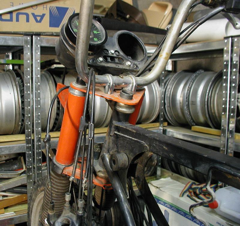 Hier spätestens finden wir den Grund für den großen Abstand des Sicherungsringes. Das arme Ding muß es mal ganz fürchterlich auf die linke Seite geschmissen haben. Es deutete darauf hin: Verbogenes Instrument, neuer Lenker, neuer Tank, andere Pedale, verschobene Tretwelle.