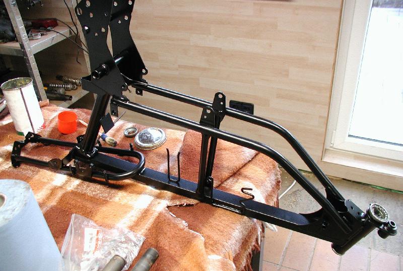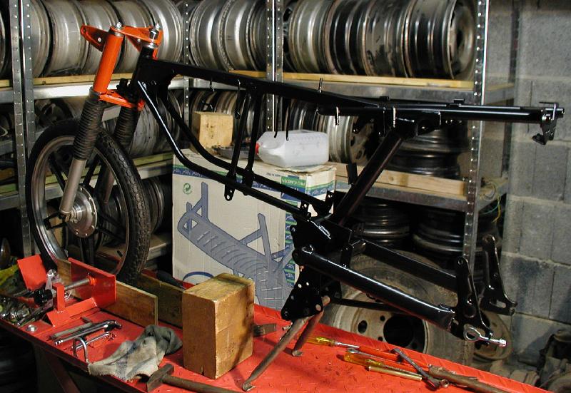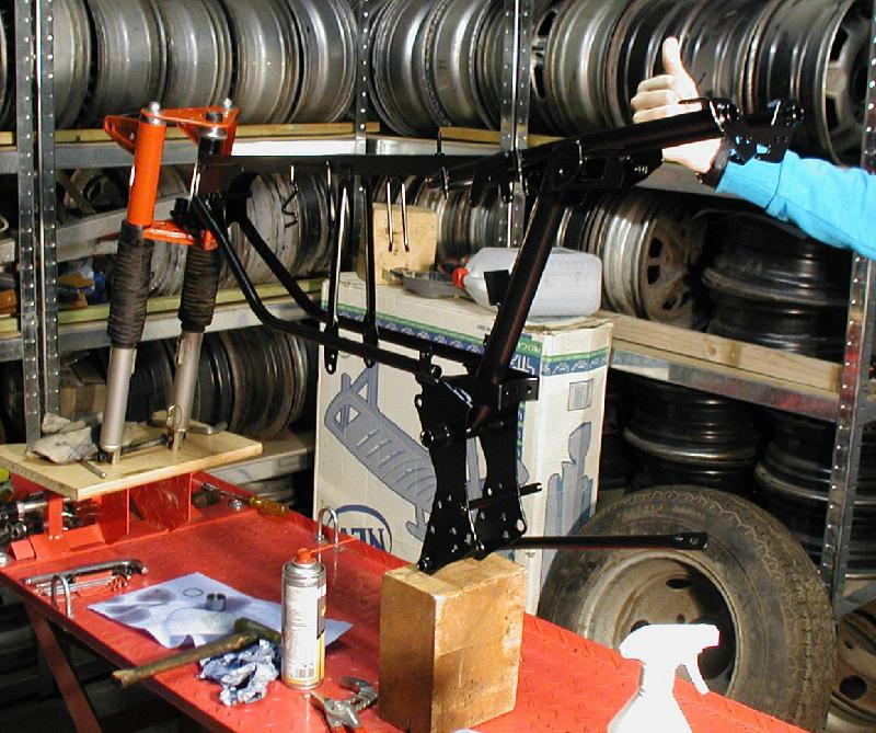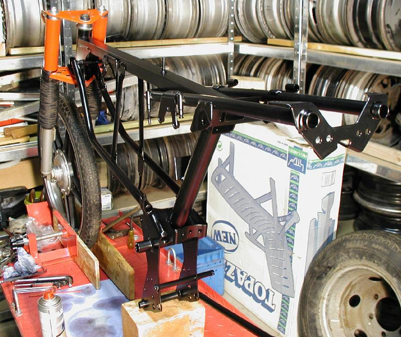 Der neu pulverbeschichtete Rahmen beim Einbau des Lenkkopflagers