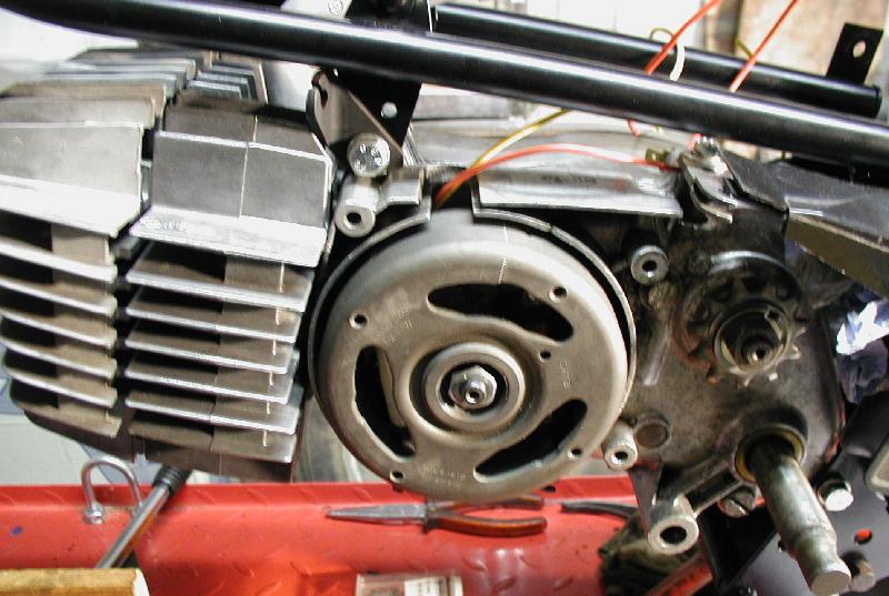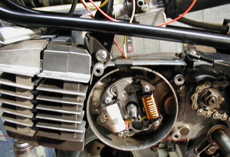Hier wurde die kontaktlose Zündung probehalber eingebaut und die neue Markierung für den OT und Zündzeitpunkt geschlagen