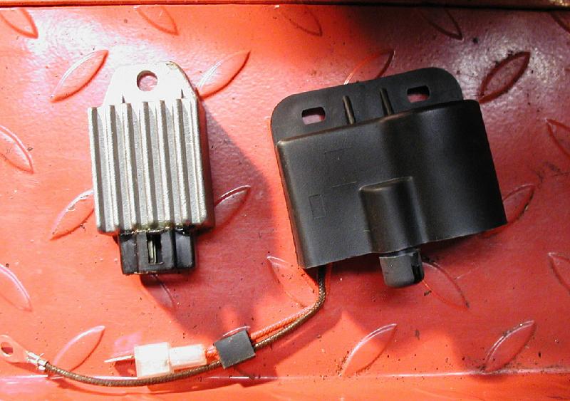 Hier die neue Zündspule und der Spannungsregler am Halteblech.