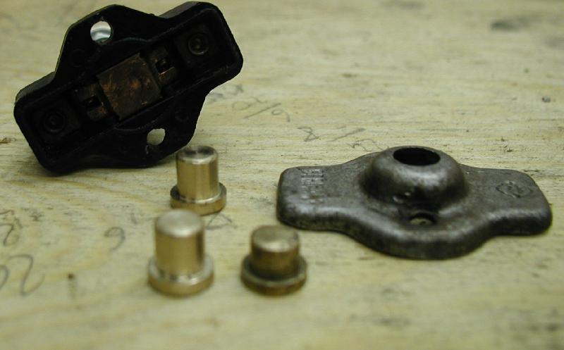 Mit der Umrüstung auf die Kontaktlose Zündung ohne extra Spule fürs Bremslicht mußten die Öffner gegen Schließer getauscht werden. Am Handbremsgriff war es einfach, die Schalter passen ganz normal. Für die Rücktrittbremse habe ich einen zweiteiligen Adapter gebaut, der in die Halterung des originalen Schalters paßt.
