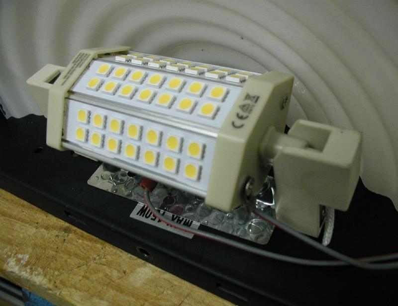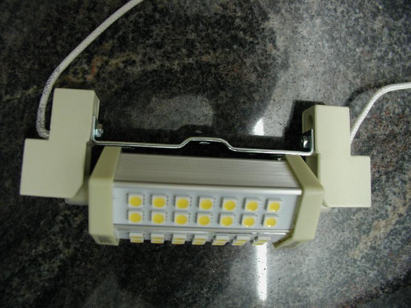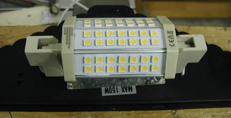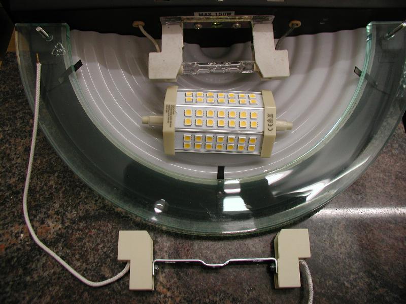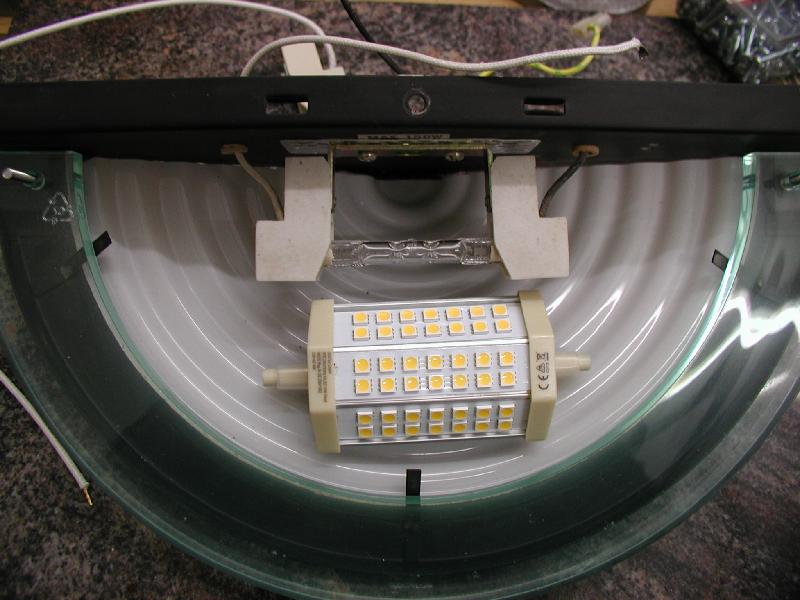 Die Leuchtstäbe sind in sogenannen R7 Fassungen mit 78 mm Breite eingebaut Die Wandlampen haben aber mehr Platz, was mir Hoffnungen machte, daß ich darin auch ein LED-Leuchtmittel für eine 118mm Fassung unterbrächte. Und es hat funktioniert.